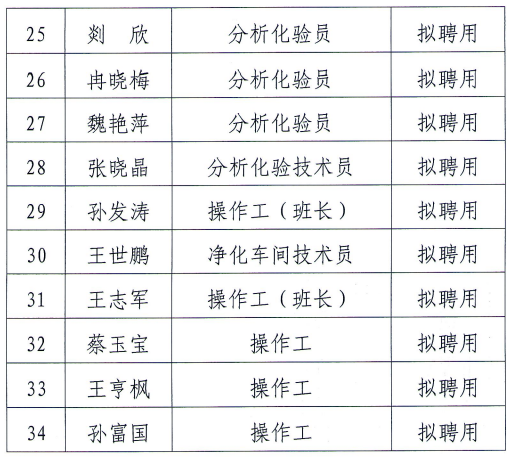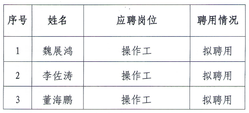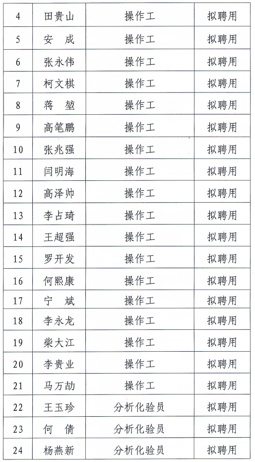 凭证《新百胜在线官网金昌能源化工开发有限公司社会果真招聘通告》 ,经由宣布通告、组织报名、资格审查、笔试面试等环节 ,拟选聘职员34人。现将拟聘用职员名单公示如下:
