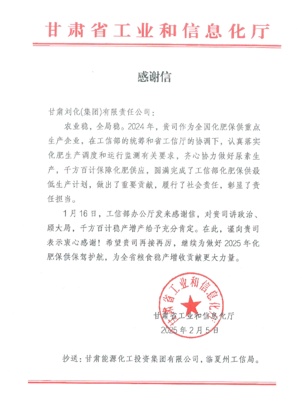 信中指出 ,2024年 ,刘化公司作为天下化肥保供重点生产企业 ,在工信部的统筹和甘肃省工信厅的协调下 ,认真落实化肥生产调理和运行监测有关要求 ,同心协力做好尿素生产 ,千方百计包管化肥供应 ,圆满完成了工信部化肥保供最低生产妄想 ,做出了主要孝顺 ,推行了社会责任 ,彰显了责任继续。希望刘化公司再接再厉 ,继续为做好2025年化肥保供保驾护航 ,为全省粮食稳产增收孝顺更鼎力大举量。