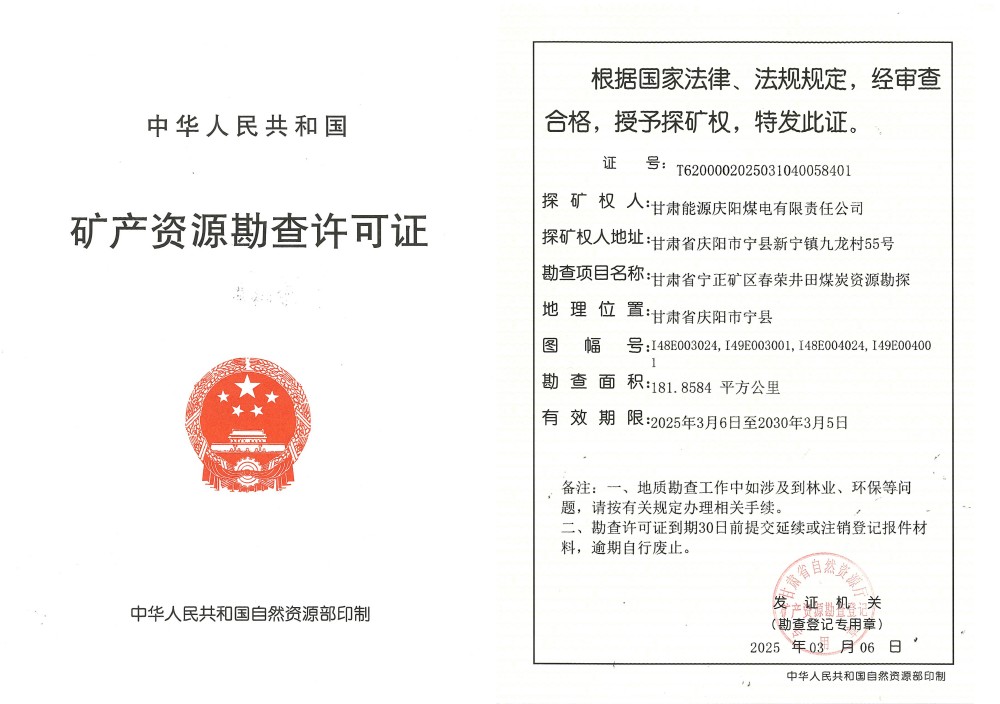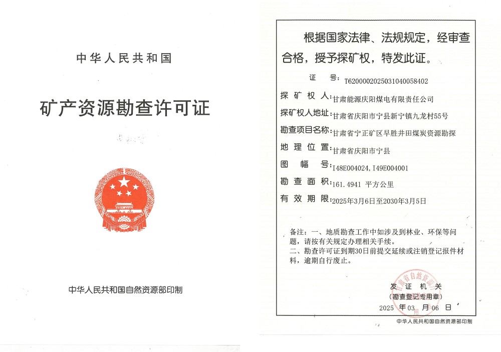 克日 ,新百胜在线官网集团宁正矿区春荣、早胜井田同时取得甘肃省自然资源厅揭晓的矿产资源勘查允许证 ,标记着春荣、早胜两个井田勘探事情实质性落地。这是继2024年11月取得九龙川煤矿采矿允许证后宁正矿区资源开发前期事情中的又一突破 ,将有力推动新百胜在线官网集团“十五五”煤炭总产能实现5000万吨目的。