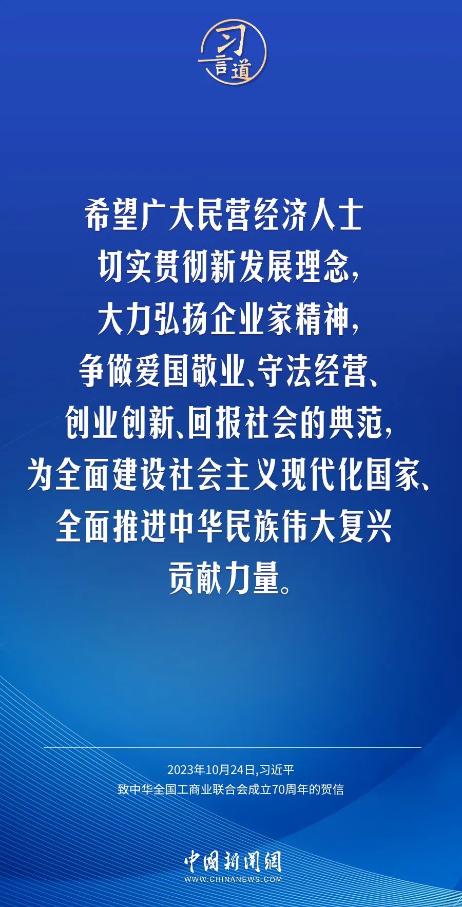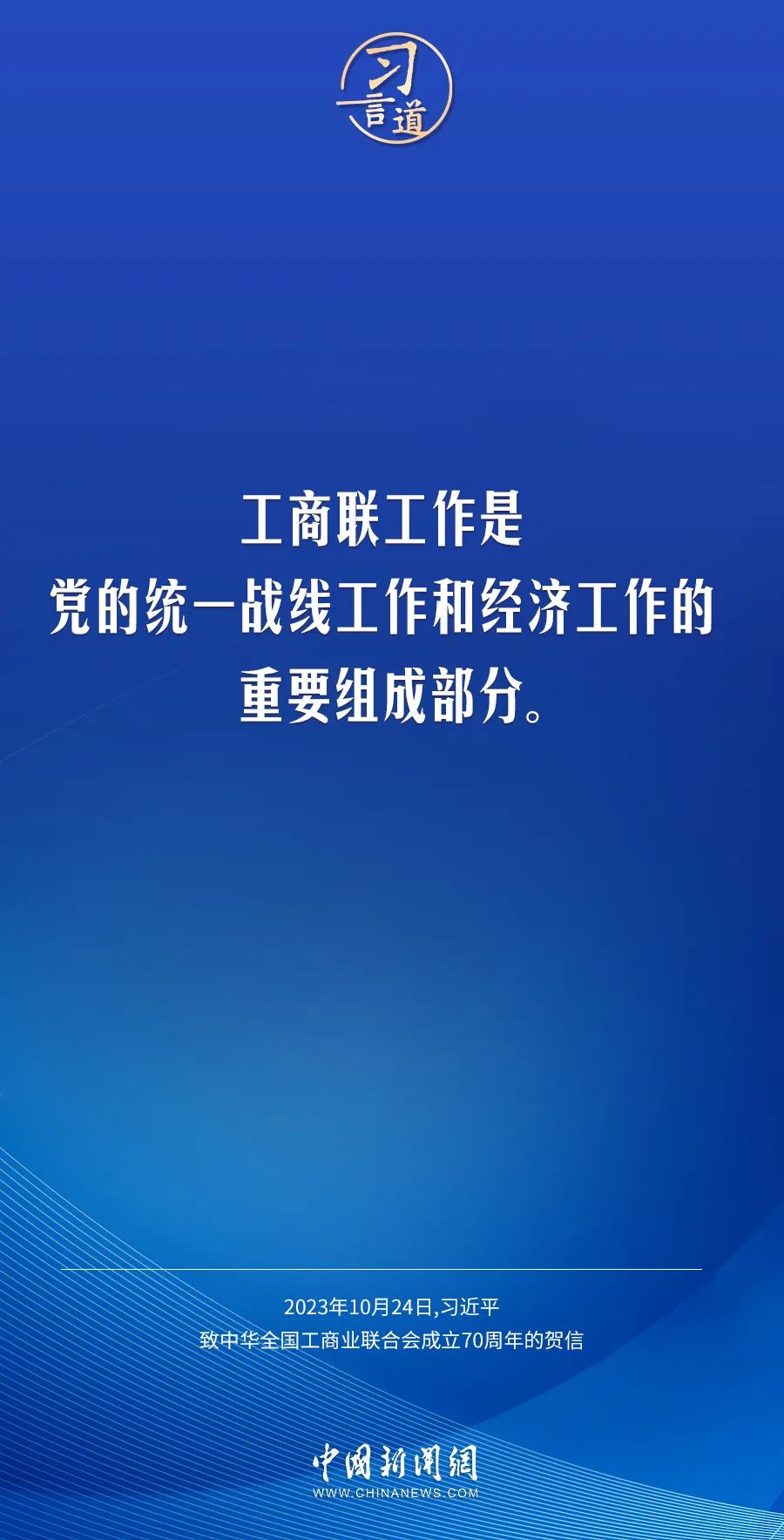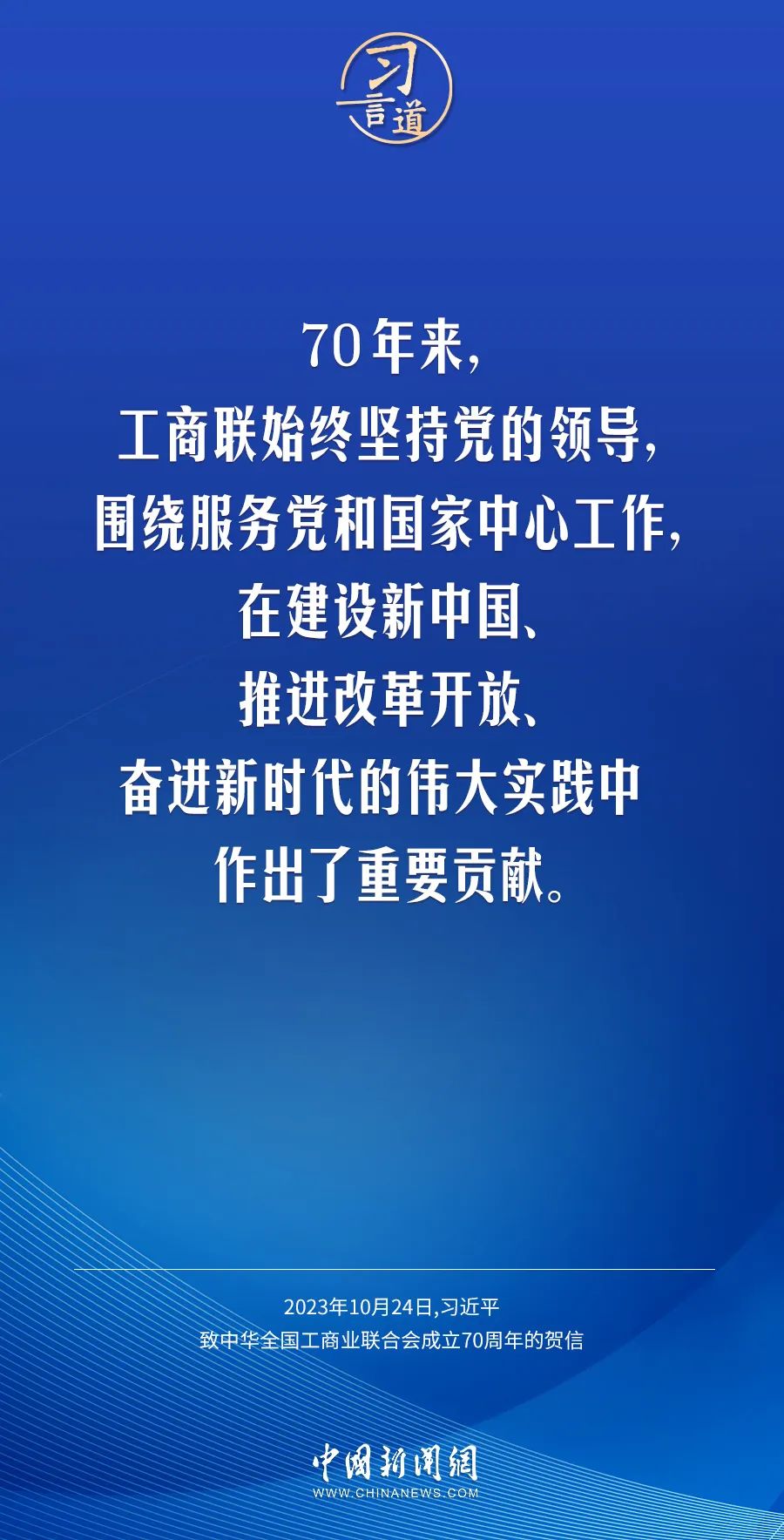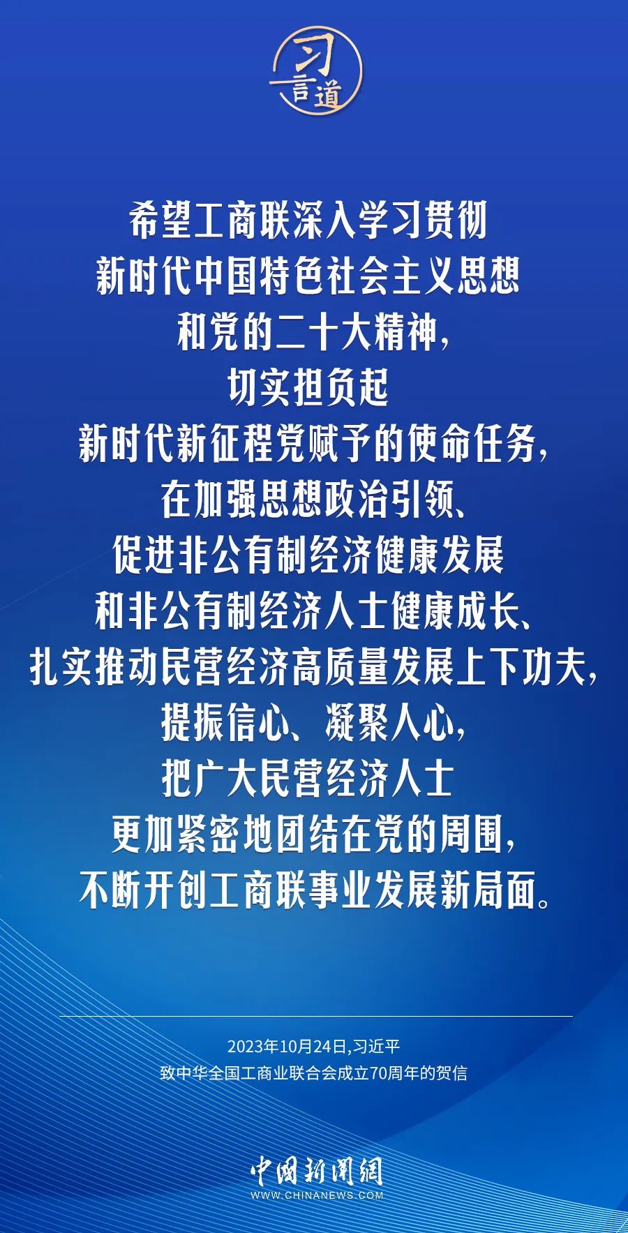 在中华天下工商业团结会建设70周年之际 ,中共中央总书记、国家主席、中央军委主席习近平发来贺信 ,代表党中央致以热烈祝贺 ,向工商联系统全体干部职工和天下宽大民营经济人士致以真挚问候。