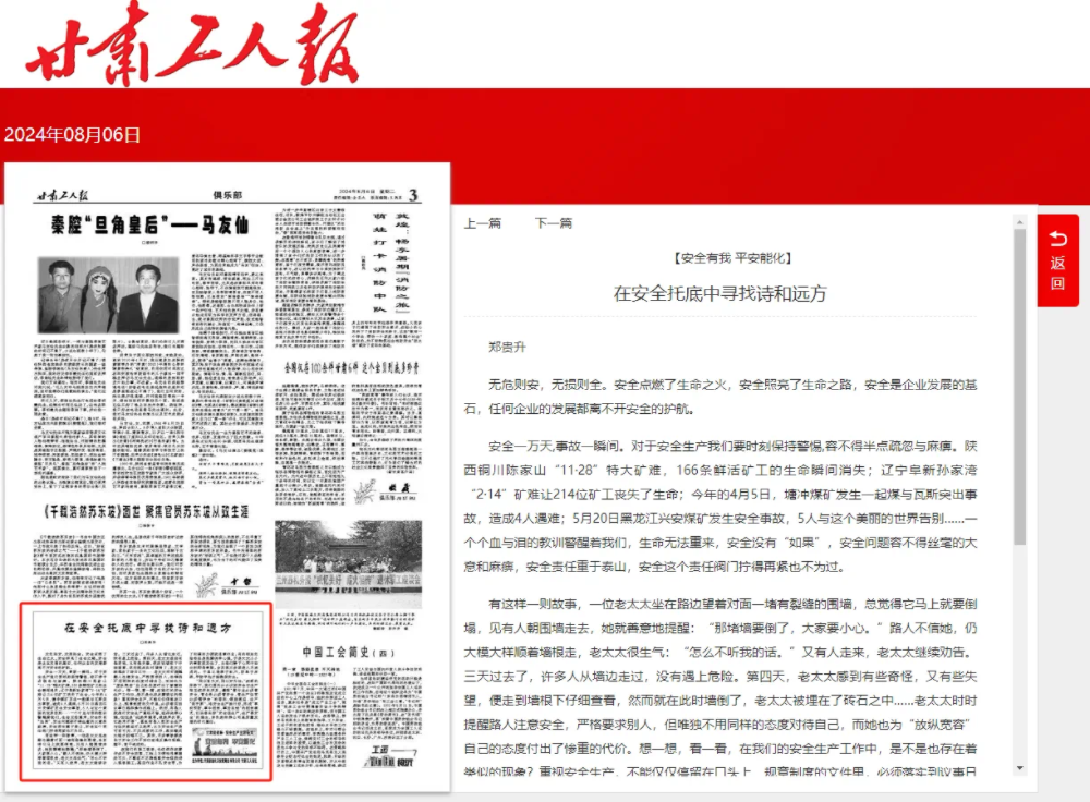 阻止现在,“新百胜在线官网杯·清静有我 平安能化”主题征文已靠近尾声,现将集团公司职工在《甘肃工人报》刊登的文章逐期编发,以飨读者。